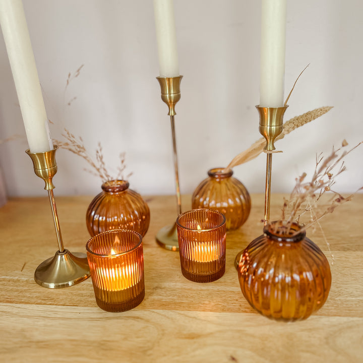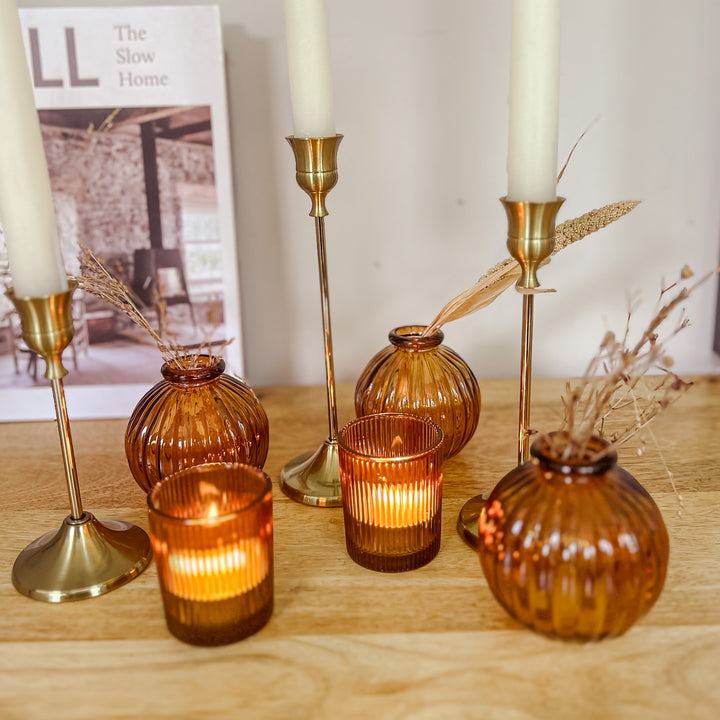 Add a warm, romantic glow to your home with our amber glass tealight holders. Designed in a ribbed glass finish, these candle holders beautifully reflect candlelight, making them the perfect addition to coffee tables, mantle pieces and dining table displays.
