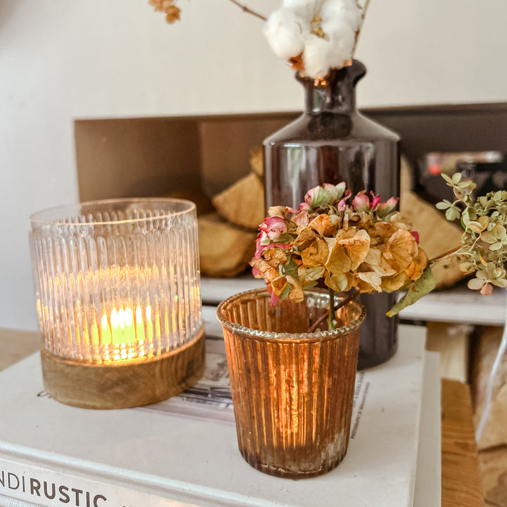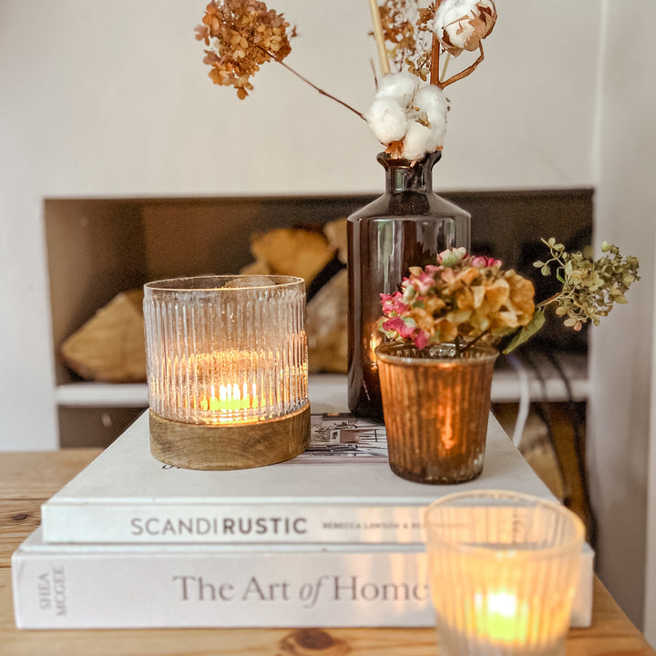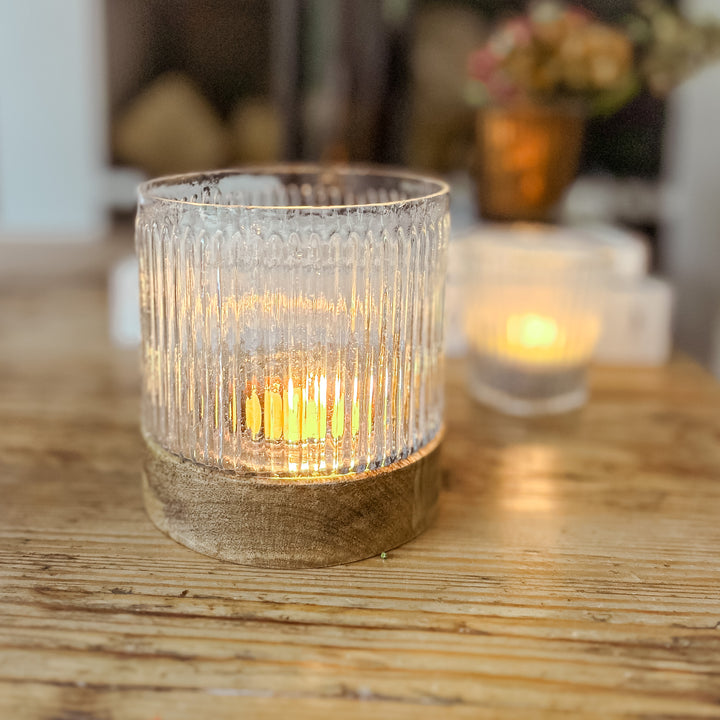 The candle holder is made from recycled etched glass candle holder with a mango wood base.