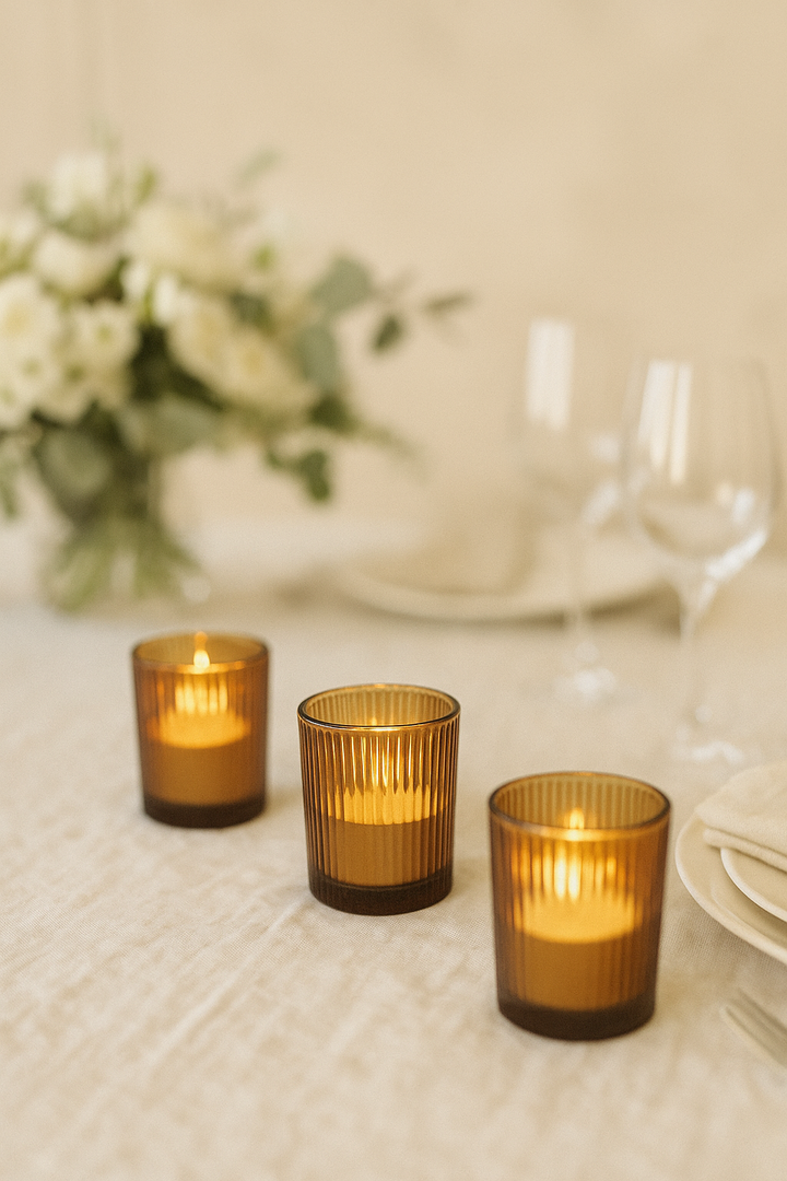 Add a warm, romantic glow to your home with our amber glass tealight holders. Designed in a ribbed glass finish, these candle holders beautifully reflect candlelight, making them the perfect addition to coffee tables, mantle pieces and dining table displays.
