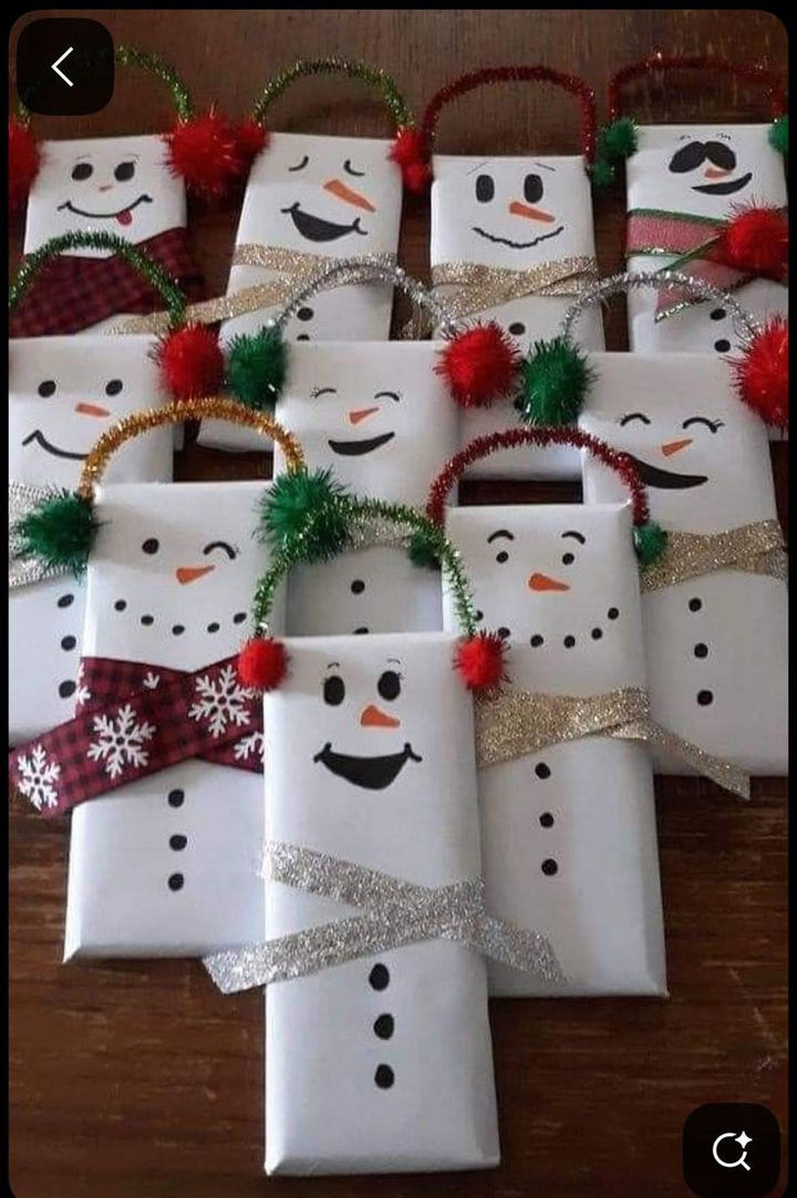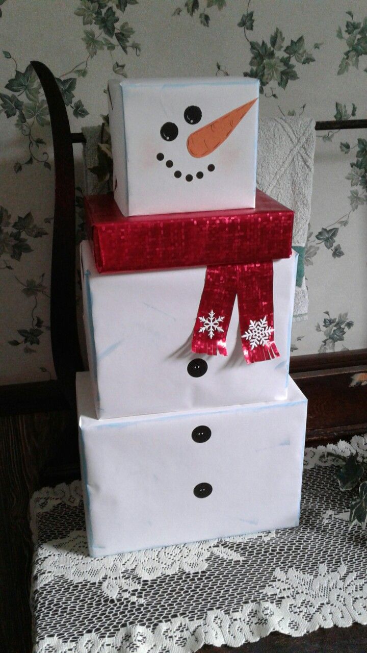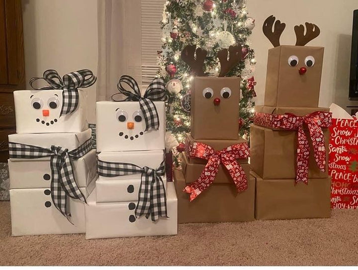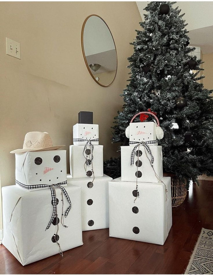 For larger gifts stack them and wrap the bottoms ones as a body and top on as a face, sit a hat on top for the finishing touches.